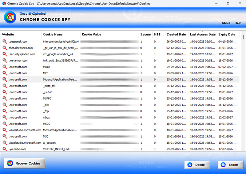 Chrome Cookie Spy : Free tool to view and delete website cookies stored by Chrome & all other chromium type browsers like Edge, Brave, Opera, Vivaldi, Arc, Maxthon etc | SecurityXploded